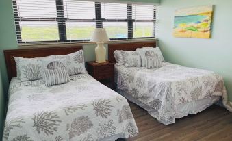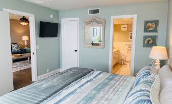 This wonderfully furnished condo features two beautifully appointed bedrooms. The oceanside master bedroom suite boasts breathtaking ocean views and hosts a comfortable king bed with luxurious linens for comfort and a mounted flat screen Smart tv with an enlarged master bathroom en suite, double vanity sinks and extra storage area.