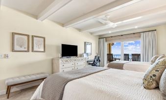 Comfortably sleeping 6, each of the bedrooms have private baths with walk-in showers (one also with a large soaking tub), two private oceanfront balconies (one covered and one uncovered), TVs in each and two thermostats providing separate temperature controls in each bedroom for maximum comfort. Guest bedroom also has a desk, PC monitor and office chair for those with a little work to do. Many of our guests tell us how comfortable the new mattresses are. Both balconies have brand-new high-quality swivel & rocking outdoor chairs & tables to enjoy the panoramic beach view and sunrise in the morning.