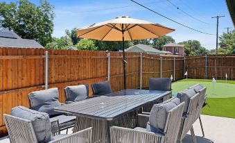 Enjoy your stay at this single story cornered home with many amenities and just minutes to Stockyards, TCU, Dickies Arena, Cultural District and many more attractions. The house is perfect for any groups of almost any size to relax and explore. It features with many amenities such as Hot Tub/Jacuzzi, Mini-Golf, outdoor BBQ dining, fully stocked coffee bar, high-speed WiFi, Smart TVs with Netflix, Hulu, and premium mattress for a good night sleep. It will be an amazing experience staying here.About pets:Pets allowed: dogs less than 20 lbs per pet (limit 2 pets total).About checkOut:Check out before 10:00 AM.About children:Children allowed: ages 0-17.About customRules:Smoking is allowed outside only! Illegal drugs and/or smoke inside will be charge of $750 for ozone treatment odor..If there's body fluid (vomit/blood/feces) anywhere inside/outside the property there will be hazard cleaning fee of $250 for EACH SPOT,Late check out after 10.00am without confirming with host will be charged $50 per hour by our cleaning company..About checkIn:Check in after 3:00 PM.About smoking:Smoking allowed: in designated areas.About minBookingAge:Minimum age to rent: 20.About events:Events allowed.Maximum event attendees: 16.
