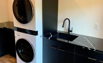 Kitchen: Fully loaded kitchen with brand new LG appliances (Gas stove, fridge, dishwasher, microwave). All cooking hardware and utensils provided for an easy guest experience. Black granite countertops and full height backsplash, lots of counter-space, and ample room to operate in the kitchen with multiple guests.
