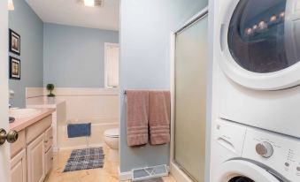 First floor: New large flat screen TV in living room, wood burning fireplace, fully equipped kitchen with stainless steel appliances, Quartz countertops, master bedroom with King and single sleeper sofa, full bath with walk-in shower and separate tub, washer and dryer and extra half bath. Living room has single sleeper sofa.