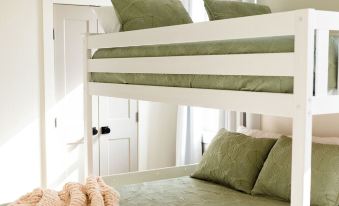 First Floor: A cozy queen room and a playful bunk room with four full beds share a Jack-and-Jill bath. The dreamy king master suite includes a private ensuite and serene vibes.