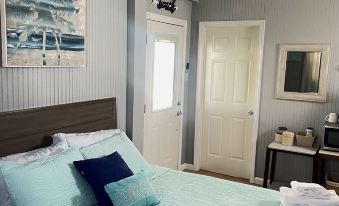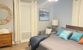Guests will find an open kitchen/dining/living area with plenty of space to hang out, cook, dine and watch TV. The dining table seats 6 and the center island bar seats an additional 3. The cooks will enjoy a variety of cooking tools and small appliances (blender, hand mixer, crockpot, instant pot, flat griddle (perfect for big pancake breakfasts), and large stock pot for that crab boil!) For the coffee drinkers, there is a drip coffee maker and a Keurig, as well as a whistling kettle for tea aficionados. On the downstairs deck, a combination charcoal/ propane grill is available (charcoal and lighter fluid to be provided by guest). The separate guest quarters downstairs is equipped with a mini fridge, microwave, and coffee maker so that snacks and beverages are close at hand when using the downstairs space.