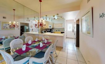 The location is convenient to many great restaurants and shopping areas. If you choose to eat in, you can dine inside or outside in the screened in patio. At sunset, relax in a lounge chair on the beach with a glass of wine, cheese and crackers, and watch the show - it's different every night!
