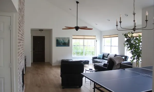 You'll feel right at home in this spacious 3 bedroom home with a large family room area with a ping pong and other games to keep you entertained. The master bedroom has a king size bed as well as attached bathroom with separate shower and bath. Two other bedrooms each have queen sized beds and plenty of closet space. The backyard has a large swim spa that can be used for both exercise an relaxation. There is a large BBQ and fireplace for your enjoyment as well. Just a 2 minute walk around the corner is a community pool and hot tub which is open in the warmer months.
