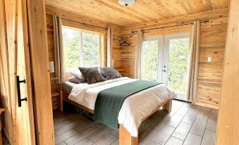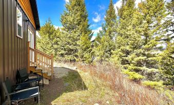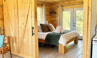 Our cabin has a primary bedroom with a queen bed accessed through a barn door from the main living space with a private bathroom. The bedroom has french doors overlooking the creek gorge that has access to two chairs and a table- perfect for morning coffee or just relax with an afternoon beer or wine following a long day on the trails. We also provide a pull-out couch in the living room for additional guests. This is the perfect spot to stay for a couple's getaway, a small family's adventure, or friends meeting up to sample Glacier.