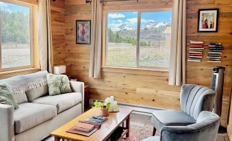 You enter the cabin into an open space with the living room on your left and kitchen on your right. The living room is very cozy with a pull-out couch (full size) and two lounge chairs, the perfect spot to watch for wildlife, admire the surrounding mountains, work on a puzzle, play music through the JBL speaker or read a book. We also provide yoga mats and a foam roller for a good stretch after a long day in the mountains.