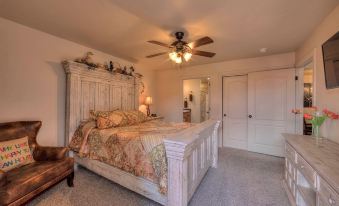 Pamper guests with extra room and amenities, as each bedroom has its own en-suite bath and flat-screen TV. Retreat to the main level bedroom, offering a queen-size bed, grand headboard, and a door out to the patio for easy access to the hot tub. Its en-suite bath has a shower and single vanity with granite counters. The main floor location and walk-in shower make it a great choice for older guests or those with mobility issues.