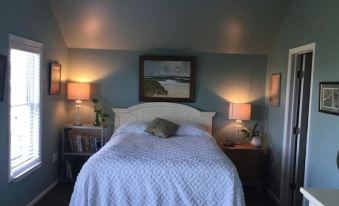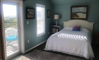 Two bedrooms with queen beds, jack and jill bathroom (shared). Second floor, private decks outside of each bedroom. Located across the street from the ocean, easy, short walk. Also, short walk to shopping, deli and beauty salon. Deck sunset. No more than one pet per reservation allowed plus $50 fee. Large yard for pets to play.