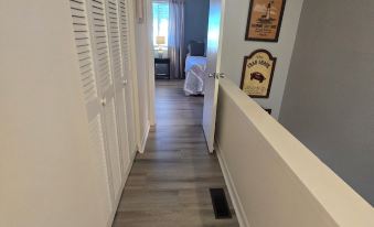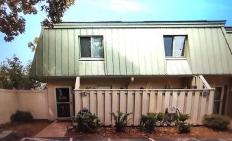 The villa entrance is at ground level. There are No stairs to climb to enter the unit. There are two bedrooms located upstairs with a full bath that was recently updated with a shower and toilet. There is a comfortable Primary Suite with King bed, Smart Roku TV and a corner desk as a convenient workspace- the other bedroom is housed with 2 Full sized beds and a Smart Roku TV.