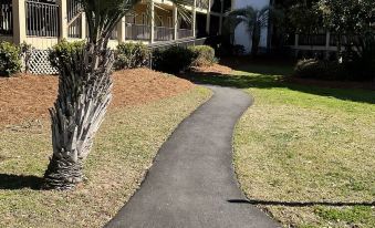 This resort has Everything on site. The largest pool on the island with kiddie pool. Cocktails served pool side great happy hour. basketball , tennis and pickle ball courts (small fee) along with several restaurants on site with outside beach bar with live entertainment during season