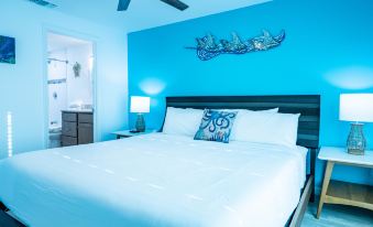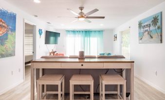 This newly renovated 2 bedroom, 2 bath half duplex is nestled in the heart of Holmes Beach on Anna Maria’s only natural spring fed lake. Enter through the yellow cheery front door greeted by tropical, coastal décor and an open living, dining floor plan overlooking the lake through two sliding glass doors off the open back porch to bring the outside in.