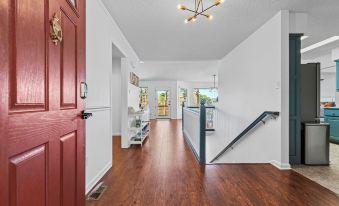 The main level is directly accessible from the garage and leads to a gorgeous Queen master bedroom with a 43-inch smart TV, lake view deck access, a suite bathroom with walk in shower, and laundry room.