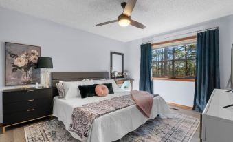 The Primary Suite features a King Bed, Premium Linens, Smart TV Bedside Tables with Reading Lamps and a Closet. There is also a Desk set up for Remote Workers!