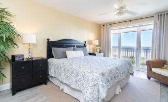 The interior of "Seaside Serenity" at 203 Ocean Palms is bright and cheery. The living room provides a perfect blend of colors and comfort. Beautiful floors and a fireplace anchor the lovely decor. The kitchen, recently renovated, is perfect for entertaining your family and has an abundance of supplies to make your family and friends gathering easy and elegant. Stainless steel appliances and quartz surfaces highlight the kitchen area. The master suite will help you dream about the pot of gold at the end of the rainbow, with access to an oceanfront deck, king bed, and private bath featuring a garden tub and separate shower. A second master suite features a king bed with a private bath. All the bedrooms feature TVs, and each has a full bathroom.