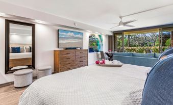 Step inside and experience the sophisticated charm of a newly renovated space, featuring a state-of-the-art kitchen equipped with modern appliances and sleek finishes, perfect for crafting island-inspired meals. The studio boasts a sumptuous king bed for a restful night’s sleep and an oversized L-shaped sleeper sofa for lounging or accommodating additional guests.