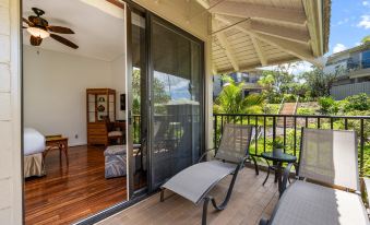 -Small private lanai with garden view has two Chaise lounge chairs off the bedroom