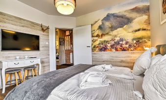 I stayed four nights with friends in two similar apartments. Each had a downstairs bedroom with a large bed, a bathroom with a shower, and a living area with a well-equipped kitchen; upstairs was a second bedroom with two single beds. There is also an extra sofa for the fifth person. The kitchens were well stocked, though the exact items varied between apartments, which is handy if you have access to both. The apartments are slightly outside the centre—about a 20-minute hilly walk without a car—but a convenience store is just 100 meters away.