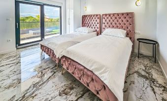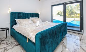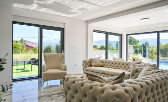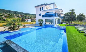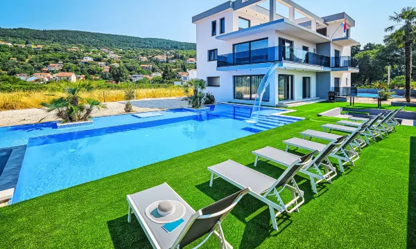 Donji Proložac 6 km from Imotski: Modern, beautiful villa "Noel", 2 storeys, built in 2024. 35 km from the sea. Private: property 700 m2, swimming pool angular (16 x 10 m, depth 25 - 160 cm, seasonal availability: 01.May. - 01.Oct.) with internal staircase. Paddling pool, outdoor shower, barbecue. In the house: internet access, washing machine. Parking (for 5 cars) at the house on the premises. Shop 2 km, restaurant 4 km, bus stop 5.8 km, pebble beach 38 km. Well-known lakes can easily be reached: Modro jezero 6 km, Crveno jezero 6 km. Please note: suitable for families. Groups of teenagers on request only. 6-room villa 190 m2 on 2 levels. Beautiful and stylish furnishings: living/dining room 70 m2 with satellite TV (flat screen), air conditioning. Exit to the terrace. 1 room with 1 french bed (160 cm, length 200 cm), shower/WC. Exit to the balcony. 1 room with 2 beds (80 cm, length 200 cm), shower/WC. Exit to the balcony. Open kitchen (oven, dishwasher, 4 ceramic glass hob hotplates, microwave, freezer, electric coffee machine). Sep. WC. Upper floor: 2 rooms, each room with 1 french bed (180 cm, length 200 cm), shower/WC. 1 room with 1 french bed (180 cm, length 200 cm), bath/WC. Exit to the balcony with 2 beds and 1 french bed. 2 balconies 4 m2, balcony 5 m2, terrace 10 m2. Terrace furniture, deck chairs (8). Beautiful view of the swimming pool and the countryside. Facilities: washing machine, children's high chair, baby cot, hair dryer. Internet (WiFi, free). Please note: non-smoking house.