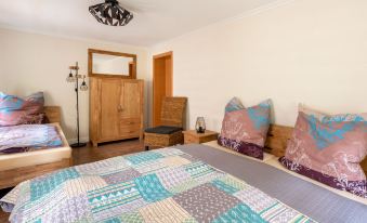 Beautiful single-family house "Dunja", built in 1850, renovated in 2021, surrounded by trees. 600 m from the centre of Oybin, on the outskirts, 12 km from the centre of Großschönau, 15 km from the centre of Zittau, 50 m from the edge of the forest, in the countryside. Private: natural state property 745 m2 (fenced) with trees, meadow. Hot tub, patio, fireplace, barbecue house, children's playground (slide, swing), public parking 300 m extra. Grocery 300 m, supermarket 3 km, restaurant 300 m, bus stop 1.5 km, railway station "Oybin" 2 km, park "Kurpark" 400 m, outdoor swimming pool 4.5 km, natural swimming pond 400 m. Walking paths from the house 50 m, ski lift 4 km, ski school 4 km, cross country ski track 4 km, children's playground 1 km. The traditional Upper Lusatian half-timbered house is a listed building. Hot tub in the garden for 6 people. Climbing rocks. 6-room house 145 m2 on 2 levels. Comfortable and cosy furnishings: living room with satellite TV (flat screen), DVD, DVD collection available and tiled stove. 1 room with 1 bed (90 cm, length 200 cm), 1 double bed (180 cm, length 200 cm), satellite TV (flat screen). Shower/WC, Sauna. Upper floor: dining room with satellite TV (flat screen). 1 room with 1 double bed (180 cm, length 200 cm), library and satellite TV (flat screen). 1 room with 1 french bed (140 cm, length 200 cm), satellite TV (flat screen). 1 room with 1 bed (90 cm, length 200 cm), 1 double bed (180 cm, length 200 cm), satellite TV (flat screen). Kitchen (oven, dishwasher, 4 ceramic glass hob hotplates, toaster, kettle, microwave, freezer, electric coffee machine). Shower/WC. Gas heating, underfloor heating. Large terrace 45 m2. Terrace furniture, barbecue (portable). Facilities: washing machine, sauna, safe, children's high chair, baby cot, hair dryer, logs (extra). Internet (WiFi, free). Parking (1 car) at the house. Please note: non-smoking house. Maximum 3 pets/ dogs allowed. Smoke alarm, fire extinguisher.