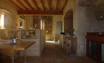 Summer house in the Costa Dorada, in hinterland, a few kilometers from the sea and well connected to the main attractions in the area. Maximum capacity for 4 people. Recommended for couples or families with children. The house consists of a single space (Sort of Loft) divided into two heights and a single bathroom. There are no locked rooms so privacy is limited. The house was built in the 90s as an independent home within an architectural complex declared of Cultural Interest, belonging to the same owner. The use of traditional materials and care, the games of light, the setting and the views, make this house a unique space very personal and completely differentiated from other offers nearby. The space is divided into two large floors. Downstairs is the kitchen, dining room, a living room equipped with two single beds and bathroom. On the upper floor, another space with double bed and sitting area and fireplace. The rooftop is conditioned with a pleasant pergola. The frame is rustic and the equipment is simple but sufficient to offer a pleasant stay. It is a perfect setting to enjoy a quiet environment but at the same time well connected with the beach. The rental entitles the use of a private pool shared with another house that is rented on the same property.