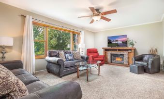 Relax in the upper level of our bi-level vacation home on 2.5 acres that sits off the main street, giving you a taste of nature, and complete privacy! This 3 bedroom, 2 bath sleeps 8 guests, and includes a beautiful Master suite! Close to town yet feels like the countryside.