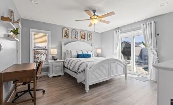 Master Suite: Enjoy the luxury of a king-sized bed, a full bathroom featuring a stand-up shower, a walk-in closet, and direct access to the pool through sliding glass doors.
