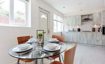 A modern large kitchen fully equipped with everything guests may need in a home away from home. Comprising of a fridge freezer and oven making our location also ideal for longer stays. The washing and ironing equipments are in the utility space underneath the stairs