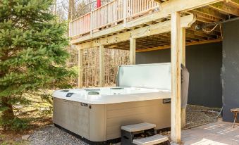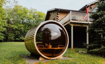 From the lower floor, you have direct access to an outdoor patio with a large high-end Bullfrog (R8) hot tub. The hot tub accommodates up to 8 people (bath sheets are provided, please bring your own slippers if you desire) and is positioned to give you those perfect mountain views. Just off the patio, there is a brand new barrel sauna with a panoramic window positioned to perfectly frame the view on Hunter Mountain.