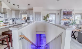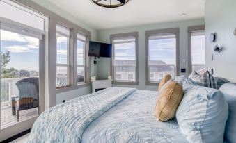 A family suite graces the second floor, with an ocean view full bedroom sharing a bath with a bunk room for the kids. Both have their own TVs. A sumptuous king suite includes a private ocean-view deck, a huge walk-in shower and soaking tub, a TV, and a fireplace. The ground-level bonus room gives you extra room to relax, with a bar, micro-fridge, seating, a fireplace, and TV, plus access to a private hot tub. The upper living room and bonus room have extra sleeping spaces tucked into seating to accommodate extra guests.