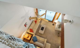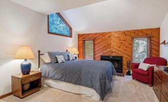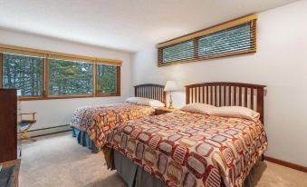 Upstairs features two bedrooms, One is furnished with a queen bed. The second bedroom has two double beds. There is a loft with two twins. These rooms share a full bathroom, making it easy to accommodate a larger group.