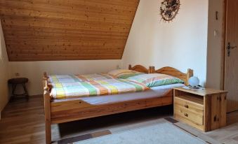 Our inviting vacation home over 2 floors is located on our spacious, with selected tree species, designed residential property and is quietly located. A lovingly designed entrance area leads directly to the bath and sauna (fee required). An oak staircase leads to the actual living area. The bedroom is laid out with high-quality laminate and carpet. The plank-like laminate and the carpets selected in modern design under the two seating groups give the room a special coziness. A generous gable glazing and wooden tiling up to the ridge underline this as well. Of considerable advantage is the connection to the partially covered balcony of 10 m², from which one can observe the colorful hustle and bustle of diverse bird species. The bedroom is equipped with a double bed and an extra bed. The garden is available as a lawn for sunbathing with a parasol and deckchairs. Bicycle storage is available. The variety of coniferous and deciduous trees, shrubs, perennials and plants invites you to linger.