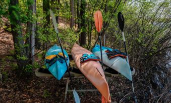 The home features a paddle boat and kayaks and canoe available for guest use along with life vests. The attached garage is not available for use at this time.