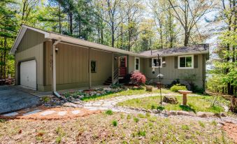 This beautiful home sits high atop a hill directly overlooking Bass Lake. The home sits on 1.75 Acres of private land with over 300 Ft of private Lake access. Plenty of space for hikes around the property, walks down to the lake or a trip out on our provided paddle boat, kayaks or canoe to explore the area off of the private dock. This home can easily accommodate 4 vehicles in the driveway, up to 6 cars could be accommodated with some swapping of spots. The home is well stocked for hosting, whipping up tasty meals, restful nights, and gathering with friends and family. Tastefully designed and decorated, this home awaits only you to make a memorable family experience.