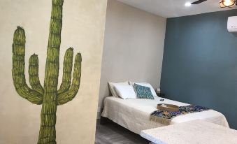 EL CARDON Studio, has a queen bed and spacious kitchen to cook lovely meals. The bathroom is detailed with natural stones and wood that makes it so unique. Go on and step out If you want to breath some nice fresh air. As soon you step in to the studio you’ll be able to name it home.