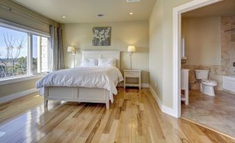The master bedroom has a king-size bed. The adjacent master bathroom features a modern, free standing soaking tub. The deep walk-in closet completes the master suite.