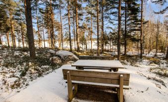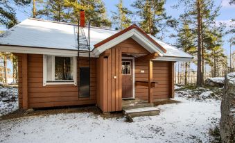 By the shore, there is a spacious cooking hut and a shallow swimming spot for shared use among the cabins in the area.