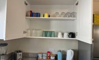 Kitchen fully equipped & functional with appliances, pots/pans, dinnerware, glassware and utensils. We also offer water, coffee and tea.