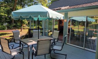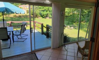 The dining room has seating for 6 and leads out to a large deck with a gas grill; deck overlooks the waterfall and creek that runs through the expansive meadow. Enjoy the fire pit in the evening while stargazing and listening to the sound of frogs as you sit by the creek.