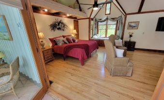 The vaulted master bedroom (king bed) has a private full bath with separate shower and a jacuzzi tub. It is attached by double garden doors that open into a sunroom which connects to the dining deck. It also has seating with a big screen tv and window seat.