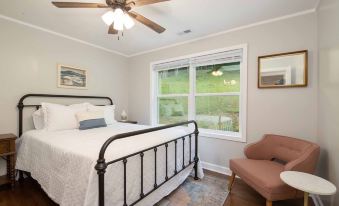 You’ll enjoy sipping coffee and tea on the deck while listening to the rushing creek, roasting marshmallows at the fire pit while gazing at the stars or surrounding mountains, cozying up with a book or movie, sleeping in on your comfy beds, luxuriating in your soaking tub, bird and wildlife viewing out the many windows, and cooking delicious meals to enjoy at your farmhouse table or take outside to the deck with mountain and pond views.