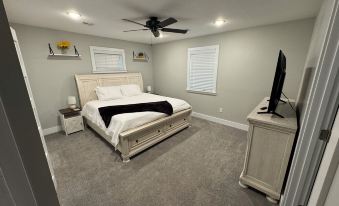 Master bedroom has king bed with dresser and two night stands. In this relaxing room you’ll find a 55 inch smart TV, two closets, and an attached master bath. In this closet there is a twin floor mattress available with linens.