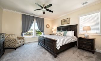 The Master Bedroom is located upstairs and has a king bed, flat screen TV, an en suite bathroom with a walk-in shower and water closet. Upstairs are two guest bedrooms that share a hall bath. One is a King with a flat screen TV and the other has bunk beds with a trundle (twin/full/twin), a flat screen TV and an XBOX 360 with games! The guest room downstairs has a King bed, flat screen TV, and its own bathroom. You'll enjoy a beautiful view down the canal from the second floor balcony and the colors from the sunrises and sunsets!