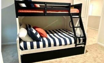 The primary suite is on the main floor and features a smart TV and an en suite bath with a walk-in closet. The remaining bedrooms can be found upstairs. The bunk bedroom has a beautiful sea captain theme with a trundle pull out bed.