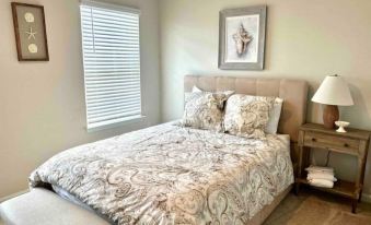 This splendid, two-story townhouse is a brand-new construction and decorated to have a nautical feel that makes you feel like you are on vacation. One of the reasons this home away from home is special and not like others is the fantastic view of the clubhouse lake, which is absolutely amazing! The sun sets over it, so don't miss it! Upon entering this air-conditioned retreat, you will discover a sunny and bright open floor plan. Wind down in the welcoming living area, furnished with cozy sofas in front of a smart TV with streaming services. The kitchen is just steps away and has been equipped with all stainless steel appliances that will make cooking a breeze. The garage space has a smart TV, a foosball table, and a beverage fridge, offering a great hidden spot that will keep you entertained during your stay.