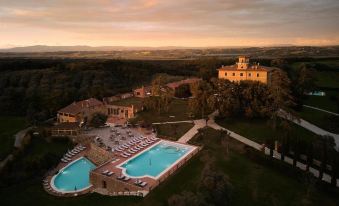 Location: The hotel is situated in stunning locations such as the rolling hills of Tuscany, with quiet, green surroundings and beautiful views. It's surrounded by lush vineyards, providing a serene and picturesque environment.