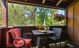 Breathe in the fresh mountain air from the balcony of this country retreat, conveniently located near Teton Village and numerous hiking trails. On frosty winter nights, turn on the electric fireplace to brighten up the room while you watch a favorite movie on the cable TV. The full kitchen offers ample cookware and counter space for preparing tonight's family meal, and the dining table comfortably seats up to eight guests (plus a tiny table by the fireplace for the kids). After dinner, let the dishwasher handle the cleanup while you take everyone out to the balcony to enjoy the views with glasses of delicious wine from Jackson Hole Winery.