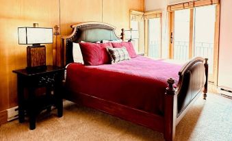 The master bedroom features a luxurious king bed with a private balcony overlooking the slopes, a large screen TV, and an ensuite bathroom with a tub and shower combination. Imagine waking up to the sight of the slopes from the comfort of your bed.