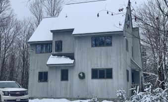 Contemporary ski chalet minutes from Okemo.living room has super comfy seating for 6-8people and a 55” tv above the gas fireplace .