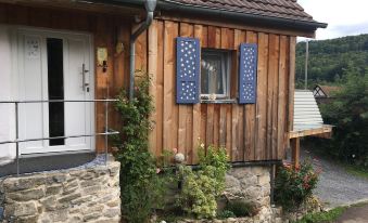 Whether cycling, hiking, jogging, just walking or relaxing in the garden or in front of the fireplace, here you can really enjoy your holiday. An approx. 300 years old small half-timbered house is waiting to be discovered by them. Note, however, the historic room height of sometimes only 1.8m. Lovingly designed mosaics, original paintings by the artist and lots of funny inspiring details invite you to discover and linger. The cozy fireplace and the old stone walls create not only on cold winter days a unique rustic "huts" atmosphere. However, the charm has small disadvantages - the ceiling height in the living-sleeping area measures only 1.80 m. The crossbar is upholstered gently and the entrance area, kitchen and bathroom have normal living room height. Charm has its price. The converted to the couch country house bed is not only comfortable, it is also versatile convertible. The flat screen TV with Smart TV, satellite TV and Netflix access can be used both from the dining table, as well as from the couch. A music system with radio and CD player is also available, CDs are on the shelf. An old kitchen table, which has also seen a lot of color in the artist's house now serves as a dining table again in a shabby chic look and comfortable wicker chairs make eating enjoyable. A wooden shelf wall separates the small bedroom from the living-dining area. It is equipped with a laptop workstation, dresser for her clothes and a French bed in pallet design. The kitchen is small but it offers everything you need. A Senseo coffee machine, kettle, dishwasher, microwave with hot air and grill, toaster, blender with blender, neat stainless steel pots and pans, spices, vinegar, oil, detergent, dishes and towels.